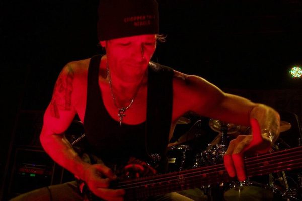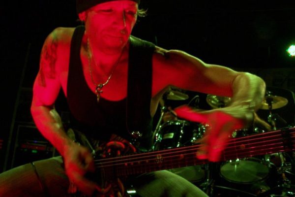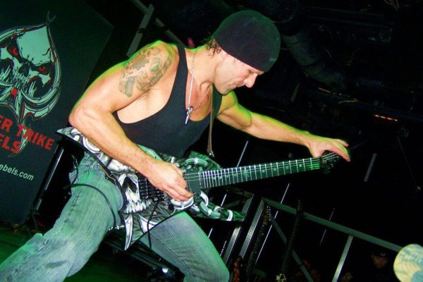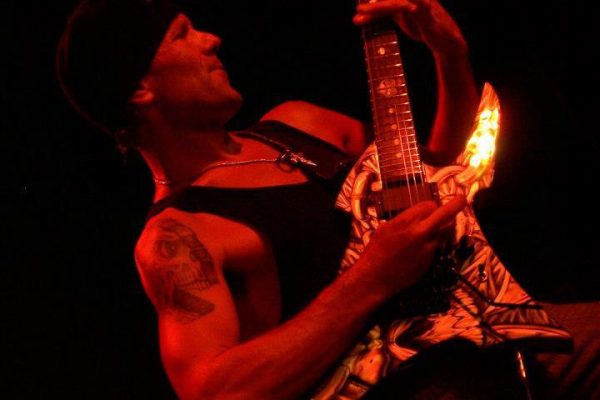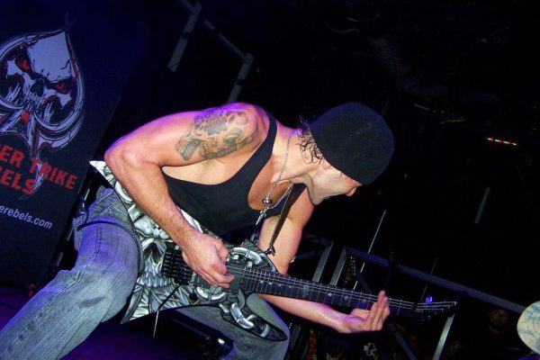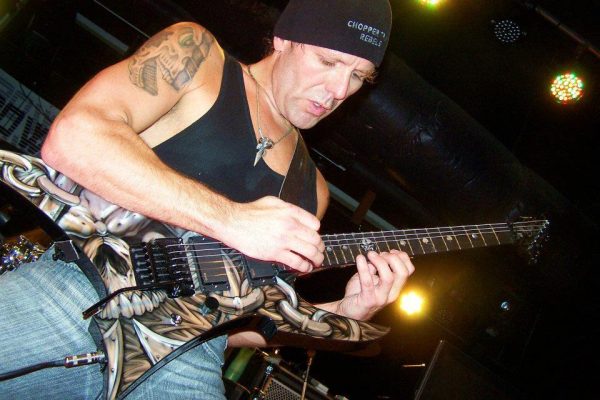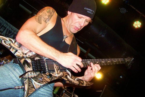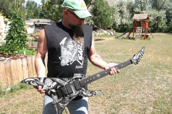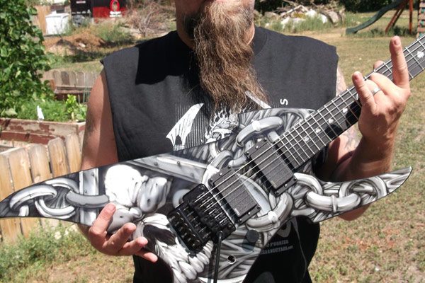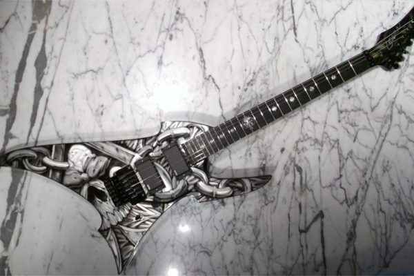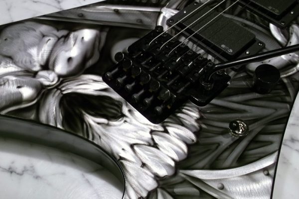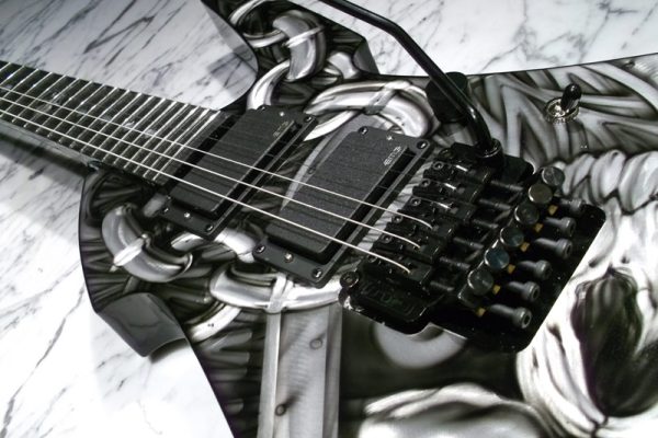 The grinded metal aluminum laminated finish was prototyped by Mike and debuted at a NAMM show on a custom Jackson. Andy saw the piece and ordered a Flak Jacket in that style.