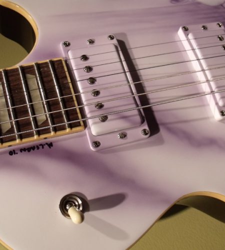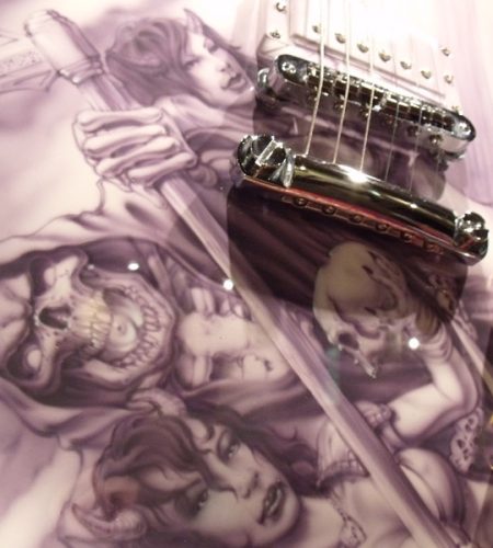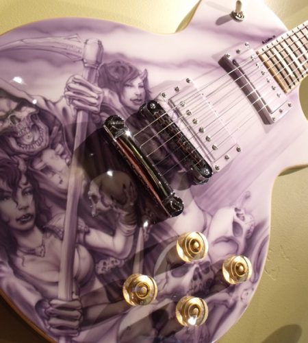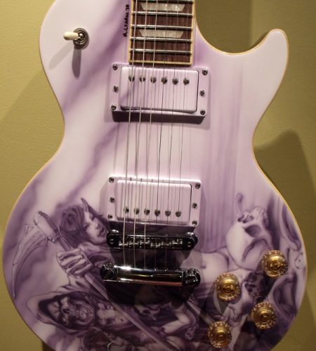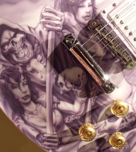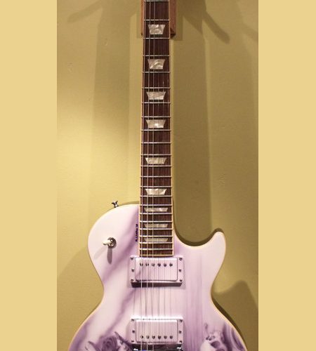 Mike just finished the re-assembly of this Les Paul project. This guitar came in from Brian in Florida. Mike removed the pick guard, filled the holes and refinished it in a gloss white base with monochromatic airbrush work.