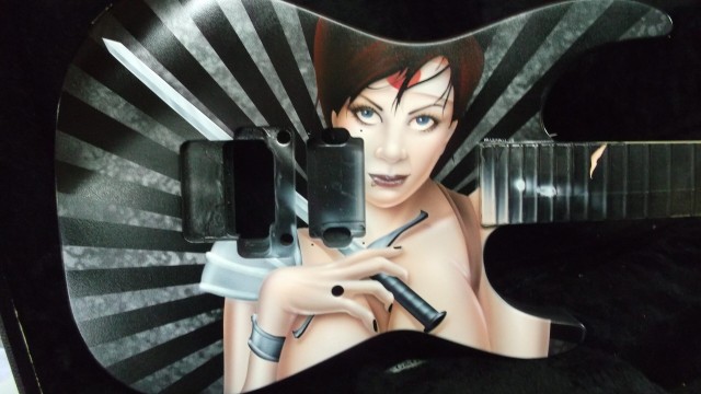 This particular run of Jackson Soloists was ordered by Guitar Center for some of their “higher end” outlets. They were looking for a series of “anime-styled Suicide Girl Samurai warriors”. As I was in the creative development phase, I really thought that it would be neat to sort of pay tribute to the Nagel guitars that were so popular in the 80’s. I wanted to give the girls a more “metal” edge, but still stay true to the classic graphic elements with some bold vector work