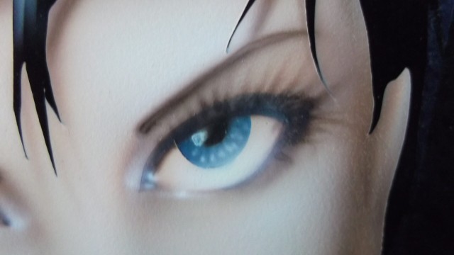 When I am generally finished with the facial features, I pull the inner eye mask revealing the iris. Small, precise strokes create the texture of what will be the eye color. Now the rest of the facial masks, with the exception of the lip ring, are removed. I give a light wash over the eye area, just so that it is not such a stark black transition, and render the lips.