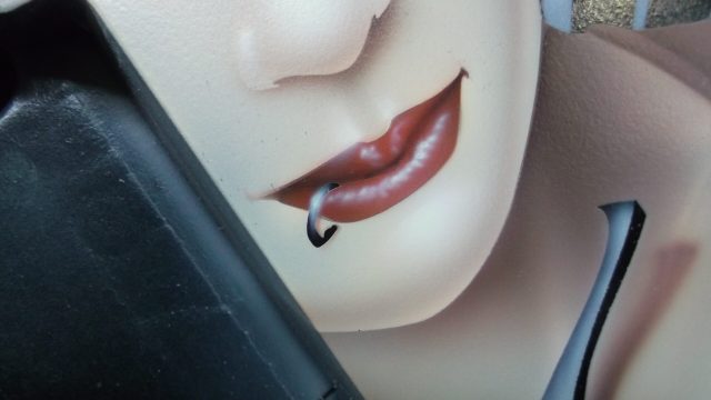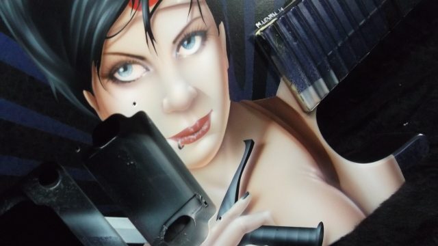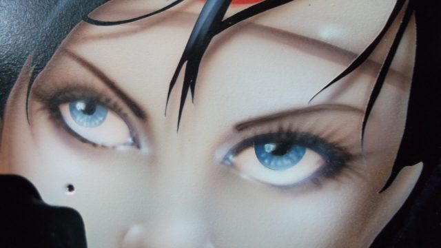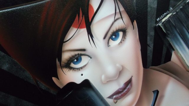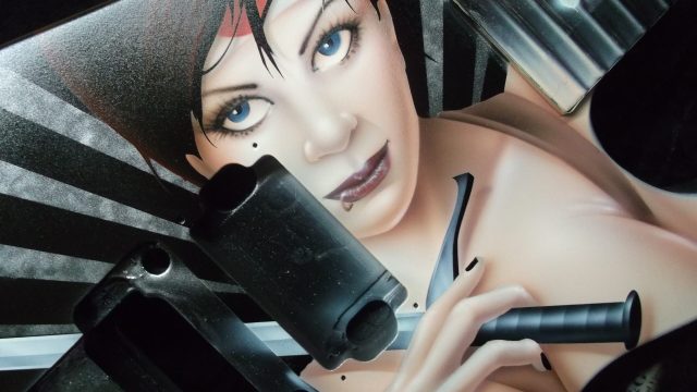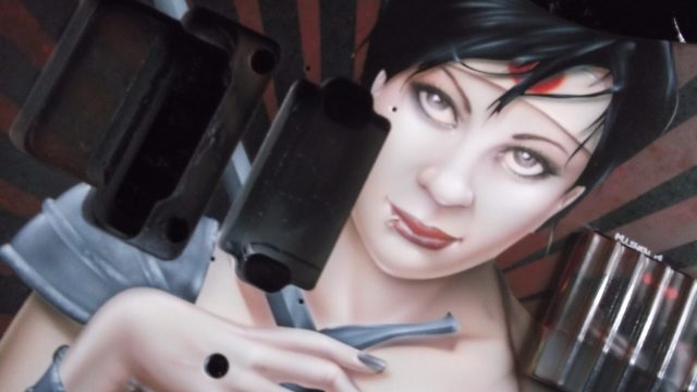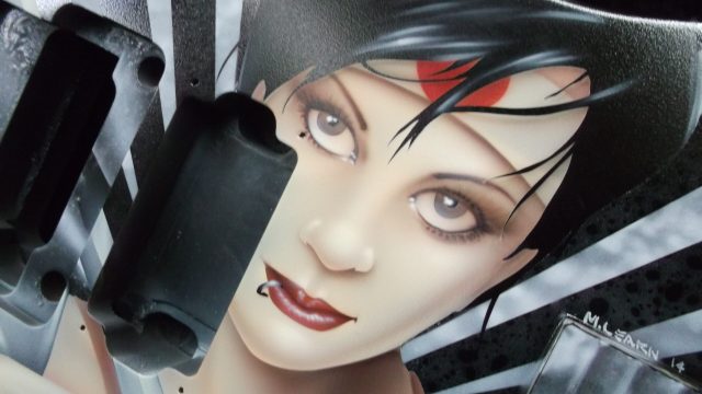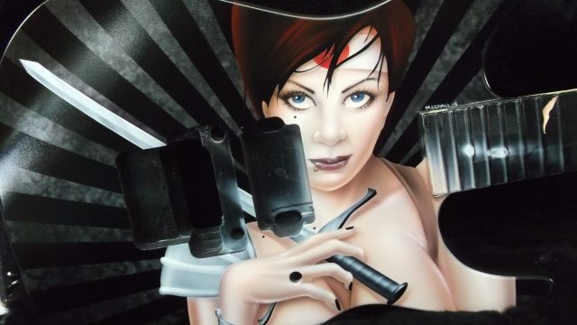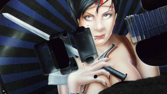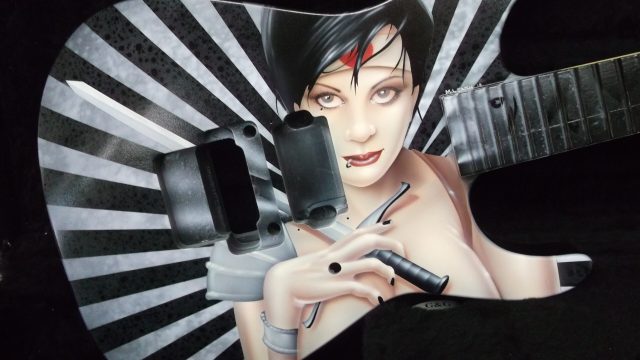 This particular run of Jackson Soloists was ordered by Guitar Center for some of their “higher end” outlets. They were looking for a series of “anime-styled Suicide Girl Samurai warriors”. As I was in the creative development phase, I really thought that it would be neat to sort of pay tribute to the Nagel guitars that were so popular in the 80’s. I wanted to give the girls a more “metal” edge, but still stay true to the classic graphic elements with some bold vector work