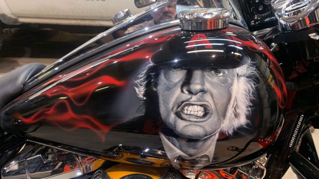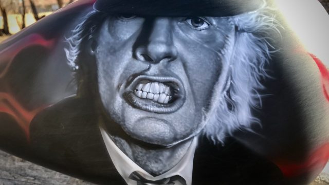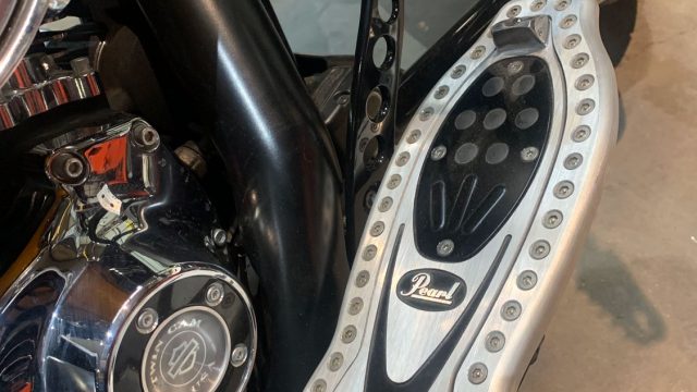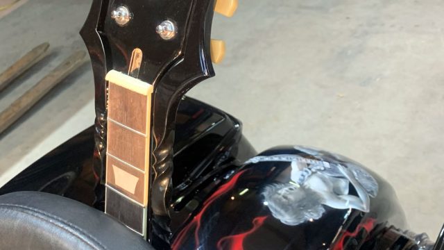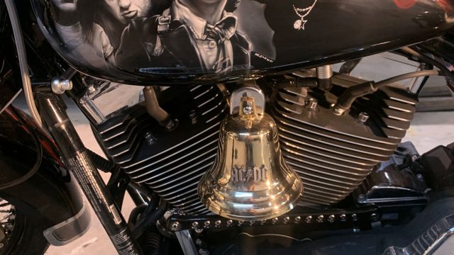 “The horn cover is Hell’s Bell, the sissy bar is an actual Gibson SG guitar neck, the kind Angus Young prefers, complimented by a twisted steel bar. The bike also features bass drum pedal floorboards, microphone grips, 80’s cassette tape brake pedal, and a “Givin’ the Dog A Bone” LED handlebar light.”