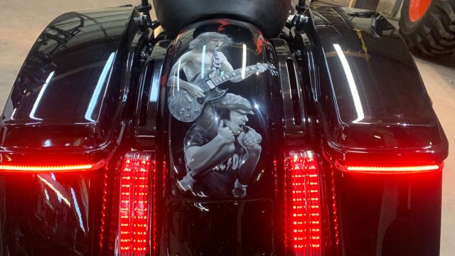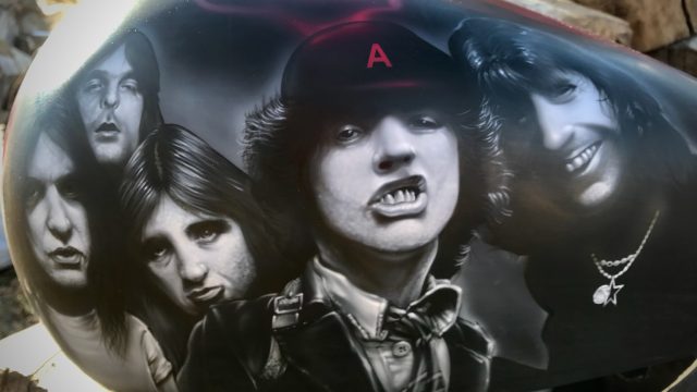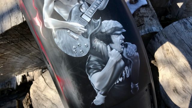This is the type of project that gets a career artist excited! As most of you know, Mike is not only an artist, but also a guitarist, bassist and luthier. One of his favorite bands is AC/DC (in fact, he played Angus in a Tribute Band called Big Balls for years – school uniform and all!) so when a local customer called us to take on this project, Mike was super excited!