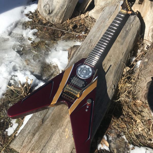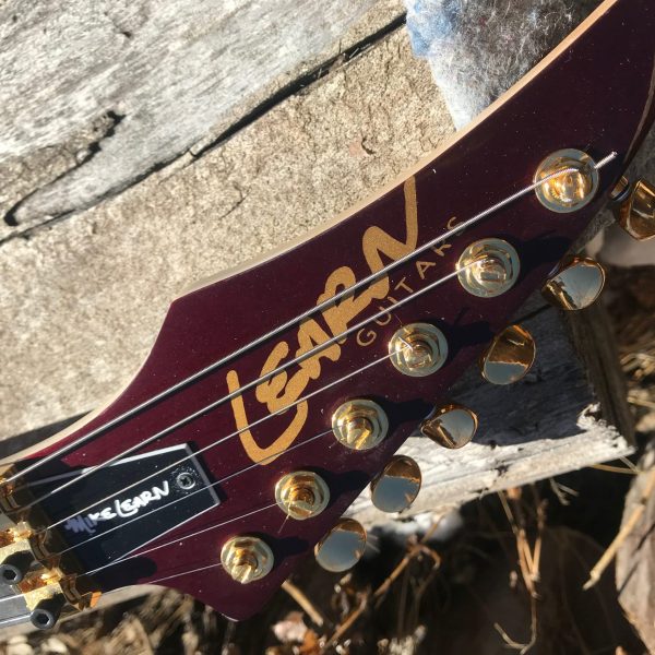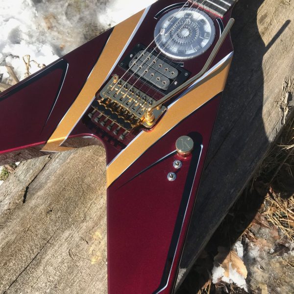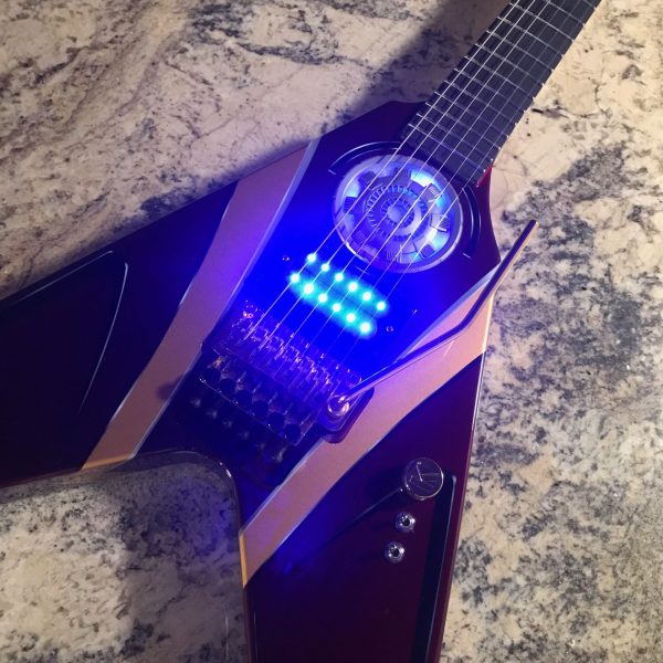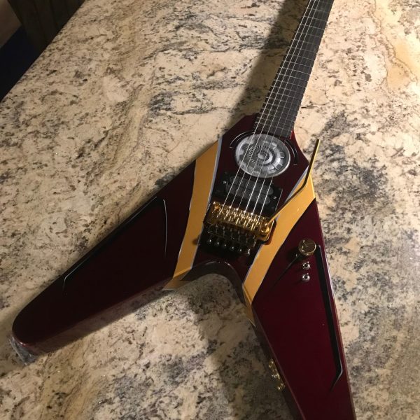 This unique custom Learn Full Access V is a tribute to Tony Stark and The Iron Man. It is a 3 piece, slim profile neck through construction with an alder body. A 22 fret ebony finger board is topped with an R-5 nut. With an all gold full floating Floyd Rose bridge and LED Studded pickups from Doug West and Parable guitars, this is a great playing instrument with lots of resonance. It is also extremely well balanced with lower string placement designed to compensate for the body shape, ensuring that it is NOT neck heavy like Vs can be.